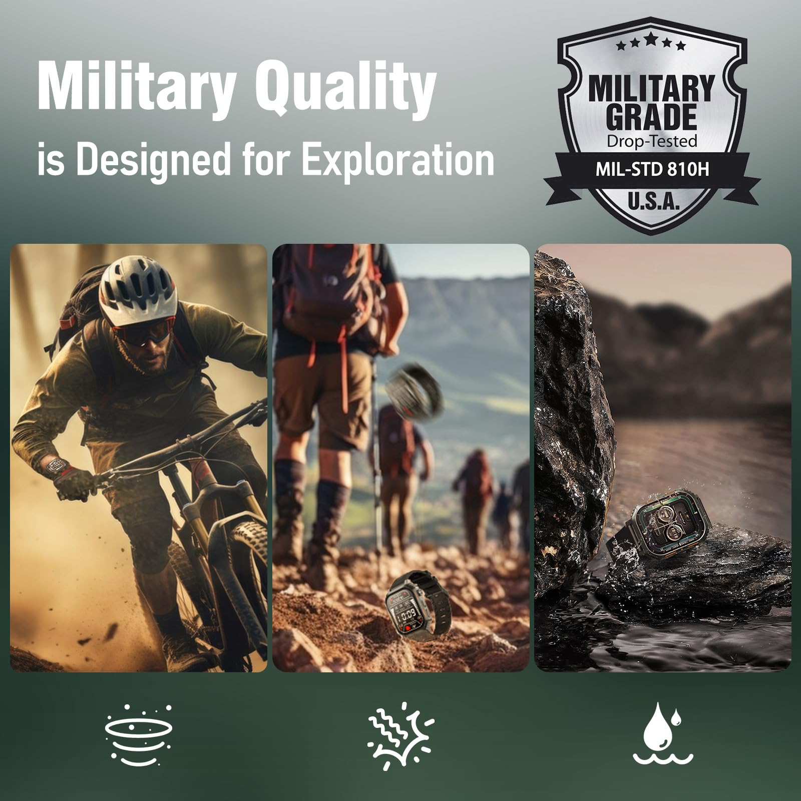 - 【100+ Sport Modes Fitness Tracker】The Military Smart watch supports 100+ sport modes, such as walking, running, hiking, basketball, cycling and more. The reference data of the exercise will be uploaded to the APP, set a goal for your exercise, and work hard to achieve it. In addition, it can also be used as an assistant: music and photo camera control, weather display, long sitting reminder, water reminder, alarm clock, stopwatch, mobile phone search,etc.