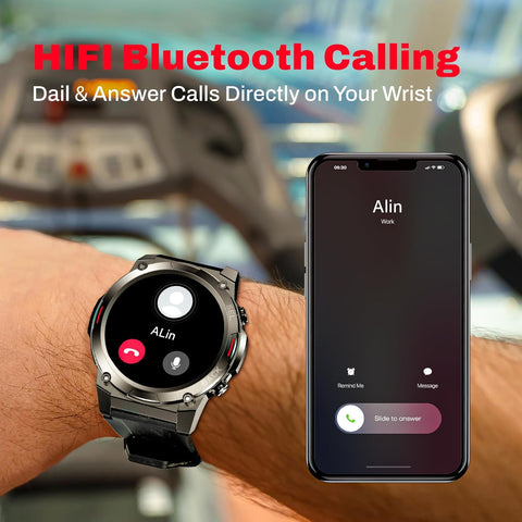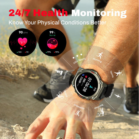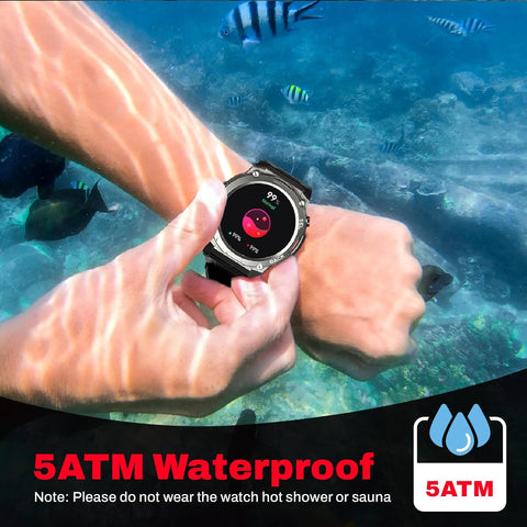 - ⌚Excellent 5ATM Waterproof-Fully enclosed all-metal body shell designed android smart watch can be immersed in 50m.The military smart watches for men has got through the demanding 5ATM rating test, so that you can wear it regarding all day-to-day water sports and activities, such as swimming, diving, surfing and beyond.NOTE: Please do not wear the watch hot shower or sauna.